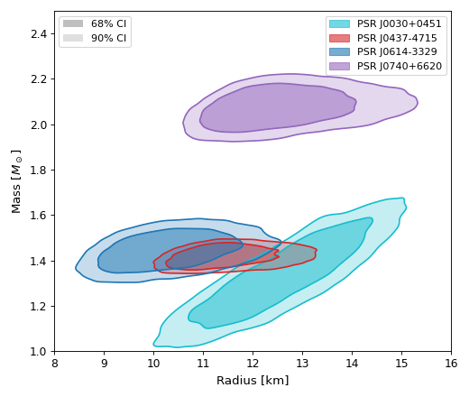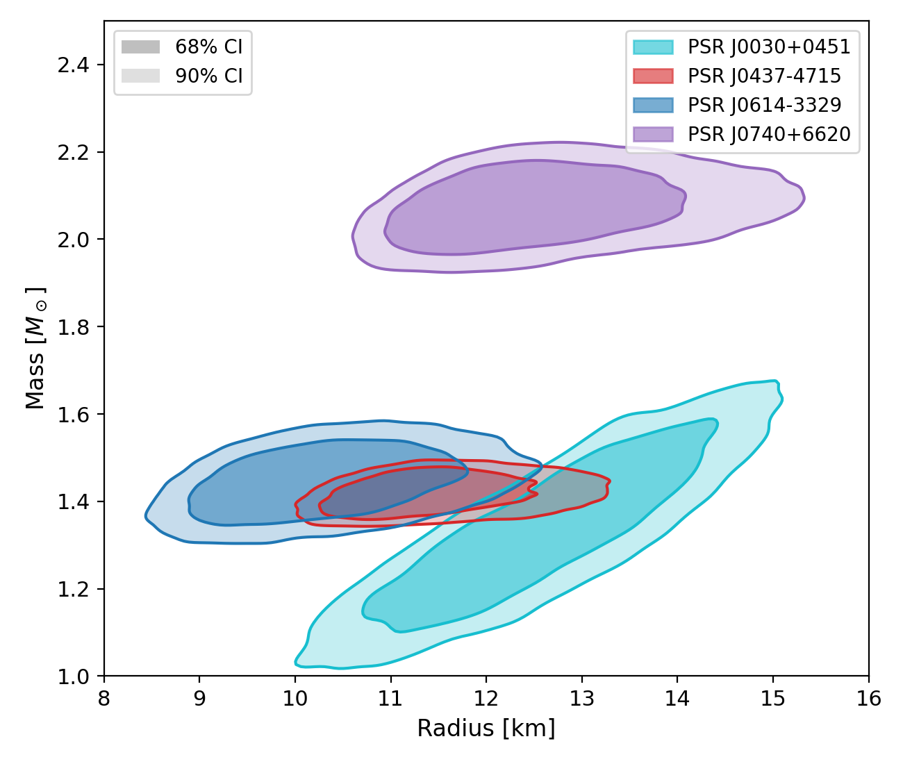 The figure below shows the mass–radius posteriors for one representative analysis per pulsar, with filled contours at the 68% and 90% credible intervals.
